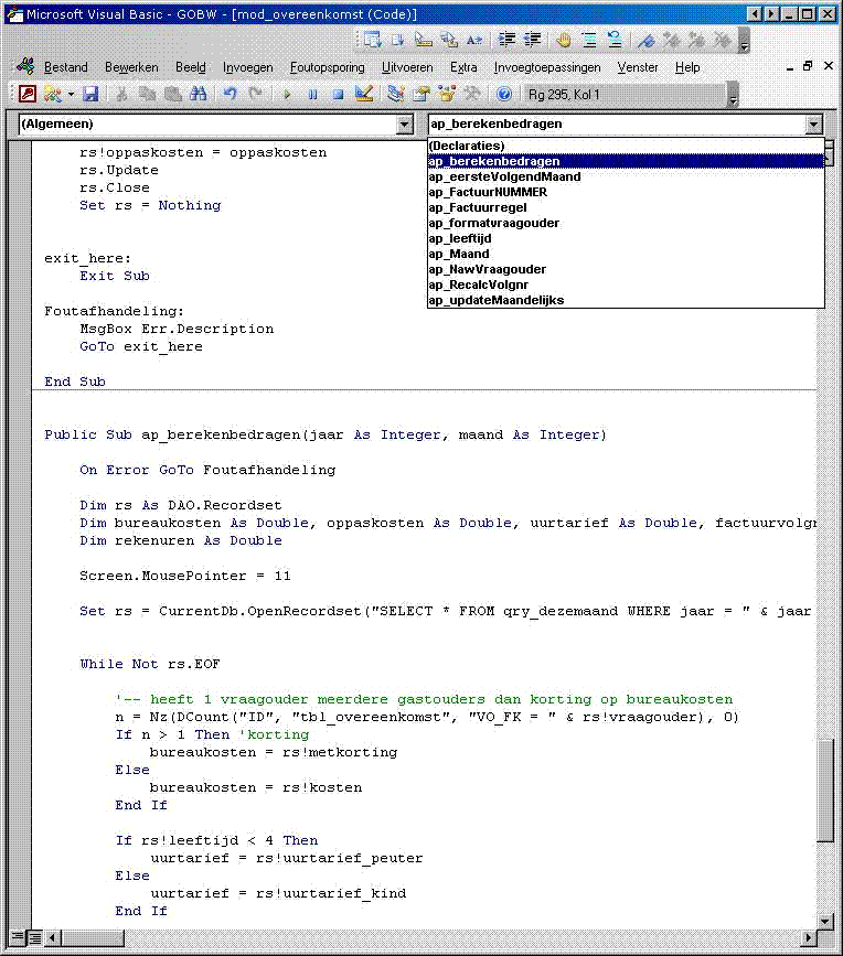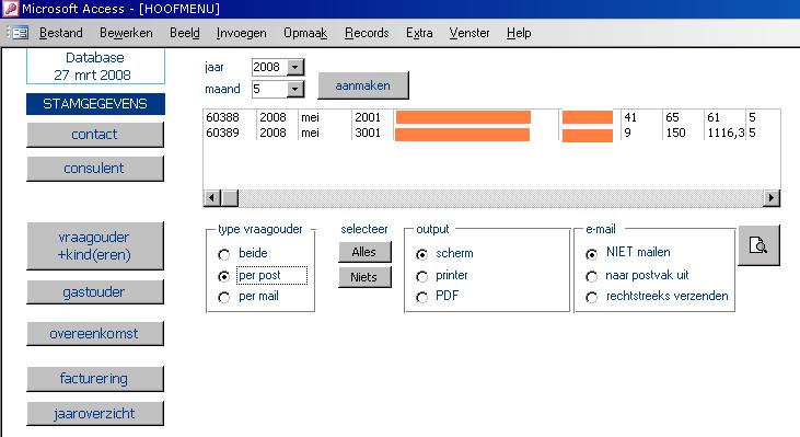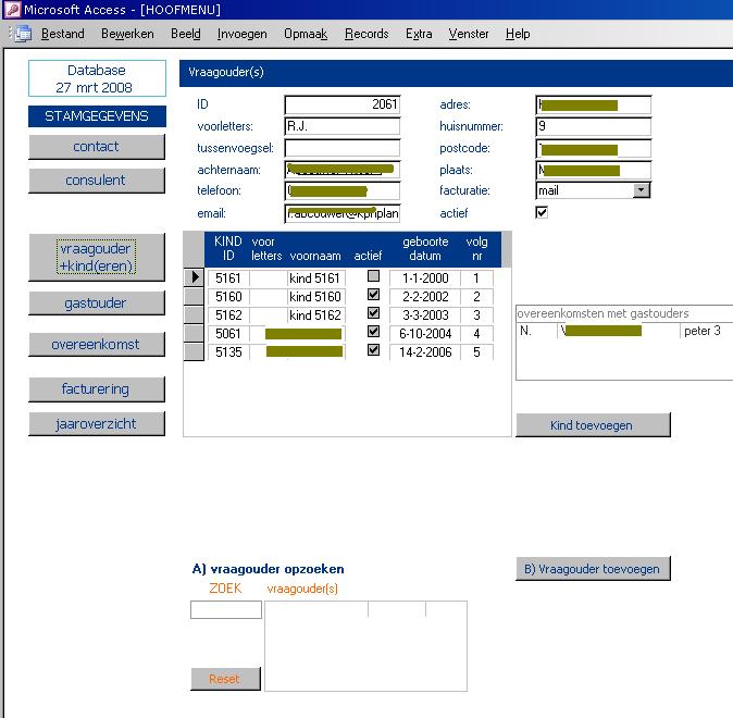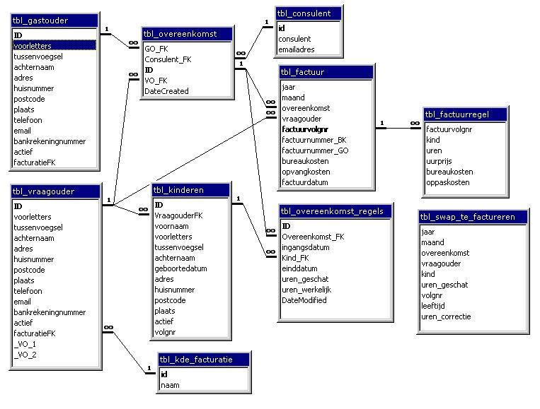 Dit systeem moet ons gaan ondersteunen bij het éénvoudig kunnen factureren van onze klanten. Hiervoor is het noodzakelijk dat de klantinformatie eenvoudig kan worden beheerd en dat ook de overeenkomsten met onze klanten éénvoudig kunnen worden beheerd. Een overeenkomst is er één tussen een vraagouder en een gastouder (unieke combinatie). Daarbij wordt er opgepast op één of meerdere kinderen. Het uurloon is voor 2008 een vast tarief van 6,10 € maar dit wijkt af per jaar. De bureaukosten (hetgeen wij als gastouderbureau per maand verdienen aan een overeenkomst) is afhankelijk van het aantal kinderen binnen een overeenkomst. De bureaukosten zijn tevens afhankelijk van het feit of een vraagouder een tweede (of zelfs derde) overeenkomst via ons afsluit met een tweede (danwel derde) gastouder. Op de bureaukosten geldt dan een kortingspercentage van 40 %. Het aantal oppasuren wordt binnen een overeenkomst per kind vastgelegd. Dit aantal uren wordt bij het vastleggen van een overeenkomst besproken. De maandelijkse facturatie vindt plaats op basis van dit aantal overeengekomen uren. Aan het eind van ieder jaar geeft de vraagouder de werkelijke uren aan ons door. Indien de gefactureerde uren (de op voorhand afgesproken uren) afwijkt van de werkelijk opgepaste uren wordt de december factuur hierop aangepast. Er wordt ieder jaar een jaaropgave voor de gastouder gemaakt waarmee de belastingaangifte kan worden gedaan. Tevens wordt er een jaaropgave gemaakt voor de vraagouder waarmee aan de belastingdienst kan worden aangetoond dat de subsidie terecht is verleend. Zowel de facturen als de jaaropgaves worden naar de vraagouder toegestuurd (bij voorkeur via mail)